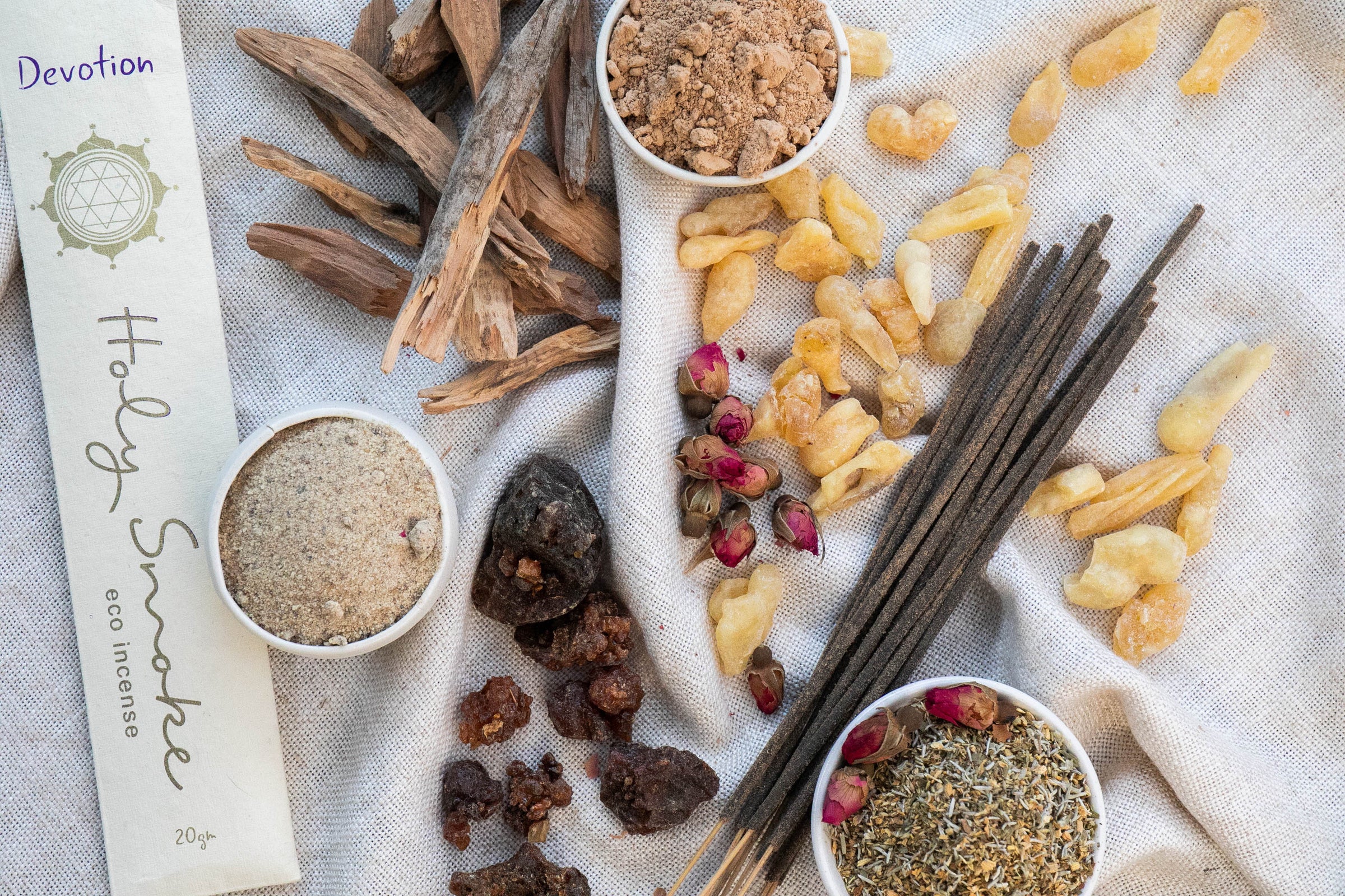 The ingredients sourced for Holy Smoke Eco Incense all include a high-quality activated charcoal - important due to its purifying qualities - resins, oils, bark powders, herbs, essential oils, aromatic woods, honey for binding and bamboo sticks.