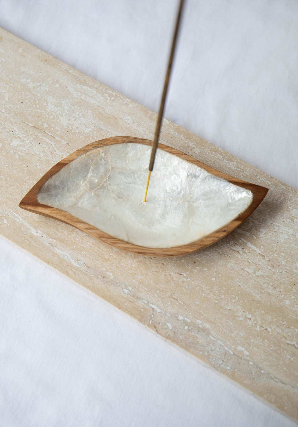 Hand carved Teak Wood Incense Holder lined with pearlescent shell. Leaf Shaped