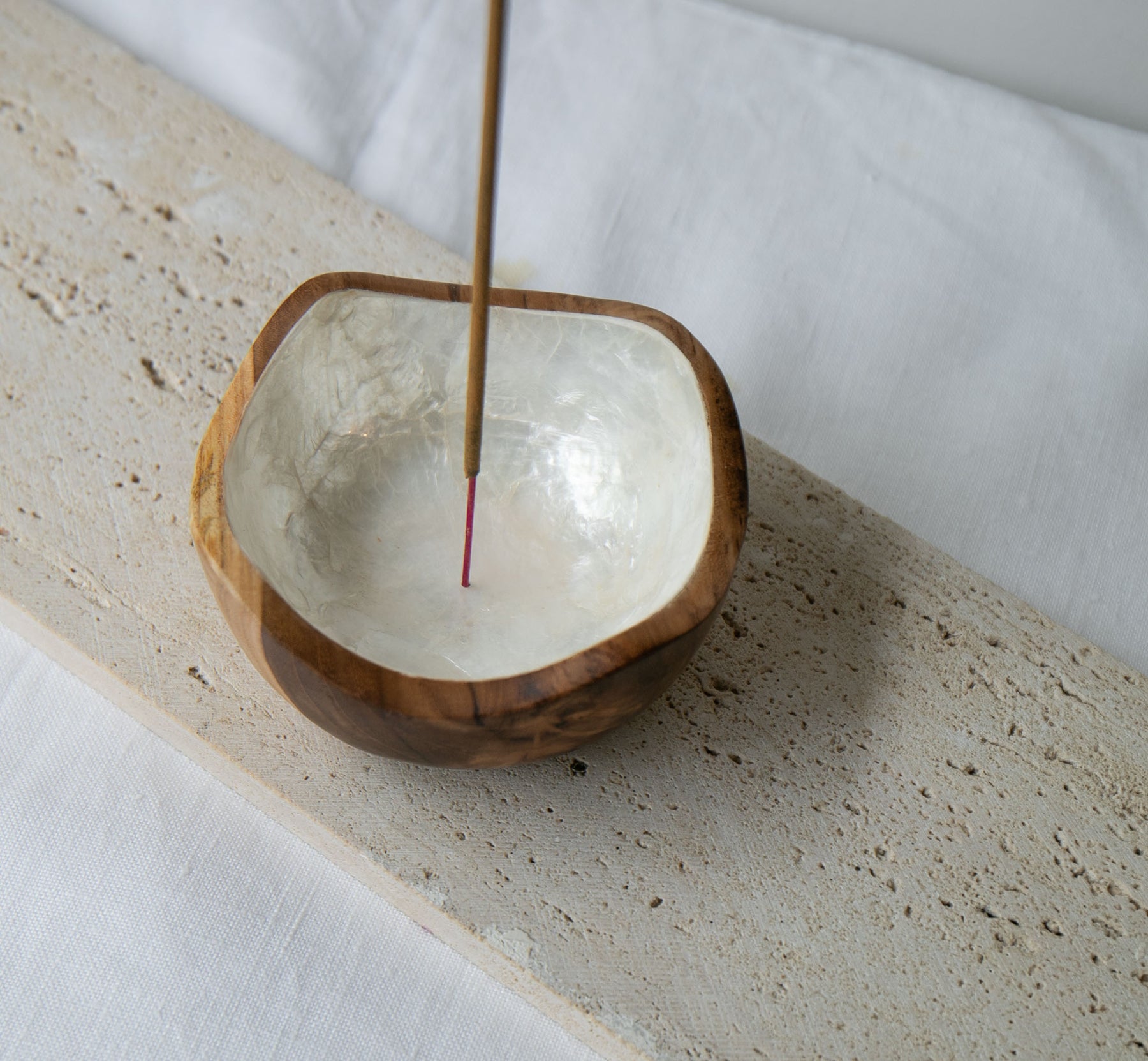 Shell Lined Organic Bowl Teak Wood Incense Holder